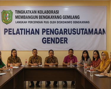 Lakukan analisis gender menggunakan GAP untuk identifikasi isu (misalnya rendahnya akses perempuan ke pelatihan literasi digital, minimnya konten kesetaraan gender di media publik). Integrasikan ke RKPD, Renstra, dan Renja DISKOMINFO, termasuk isu strategis, sasaran, dan indikator kinerja. Pastikan kebijakan teknologi informasi mendukung kesetaraan gender.