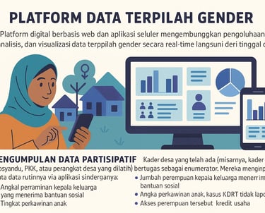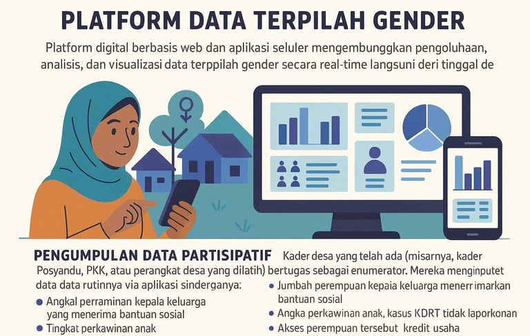 Pengumpulan Data Partisipatif: Kader desa yang telah ada (misalnya, kader Posyandu, PKK, atau perangkat desa yang dilatih) bertugas sebagai enumerator. Mereka menginput data secara rutin melalui aplikasi sederhana di smartphone. Data yang dikumpulkan meliputi data demografi dasar, mencakup indikator-indikator spesifik gender seperti: jumlah perempuan kepala keluarga yang menerima bantuan sosial, tingkat partisipasi perempuan dalam musyawarah desa, angka perkawinan anak, kasus KDRT yang tidak dilaporkan, akses perempuan terhadap kredit usaha, dan lain-lain.