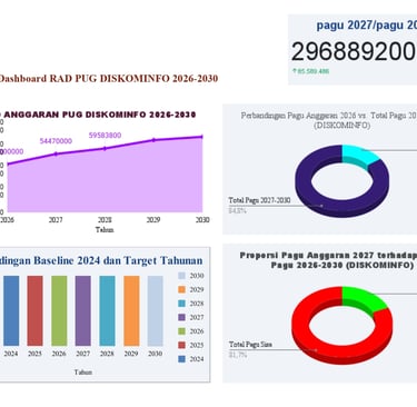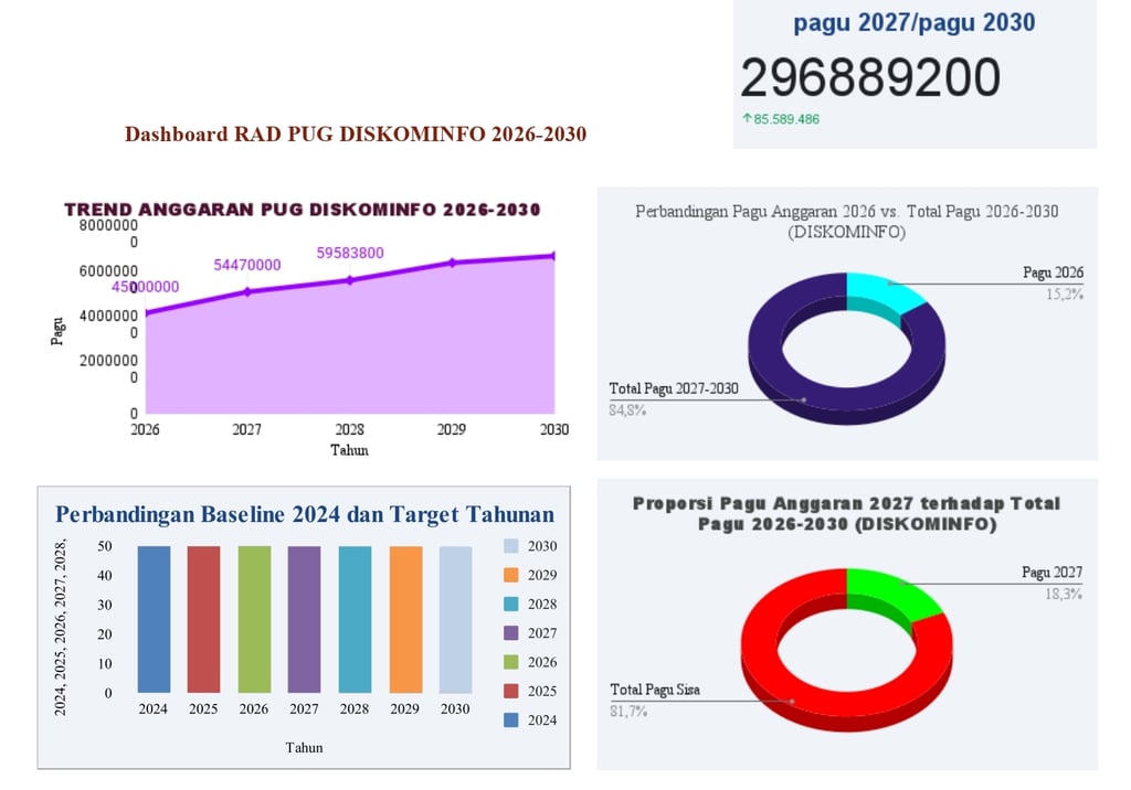 Terdapat tren peningkatan total anggaran (Pagu) yang stabil dan signifikan untuk program yang tercantum dalam Rencana Aksi DISKOMINFO dari tahun 2026 hingga 2030.